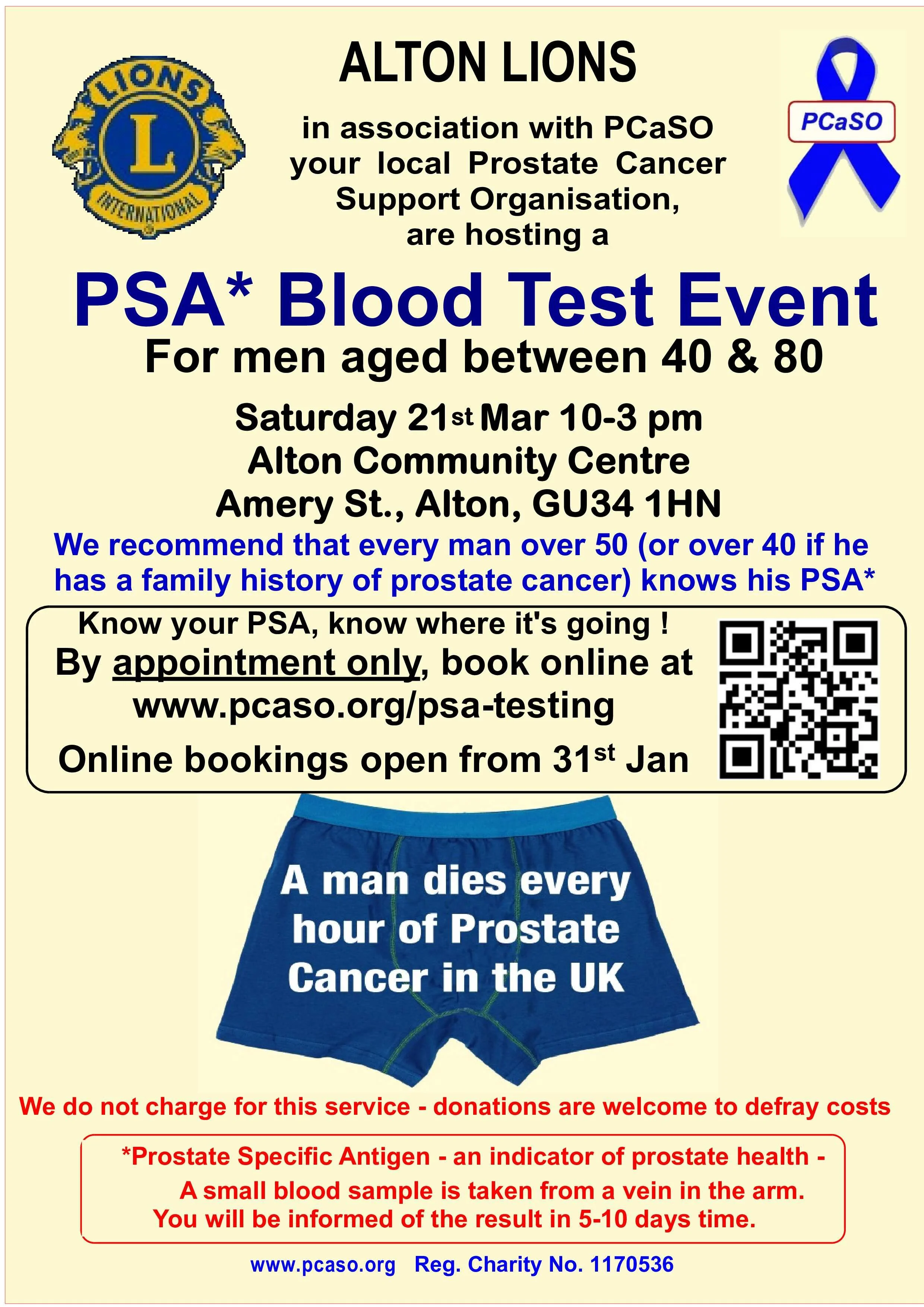 The Alton Lions Club, in partnership with the Prostate Cancer Support Organisation (PCaSO), has announced a community-wide PSA blood testing event aimed at early detection and awareness. The event is scheduled for Saturday, 21st March 2026, from 10:00 am to 3:00 pm at the Alton Community Centre on Amery Street.